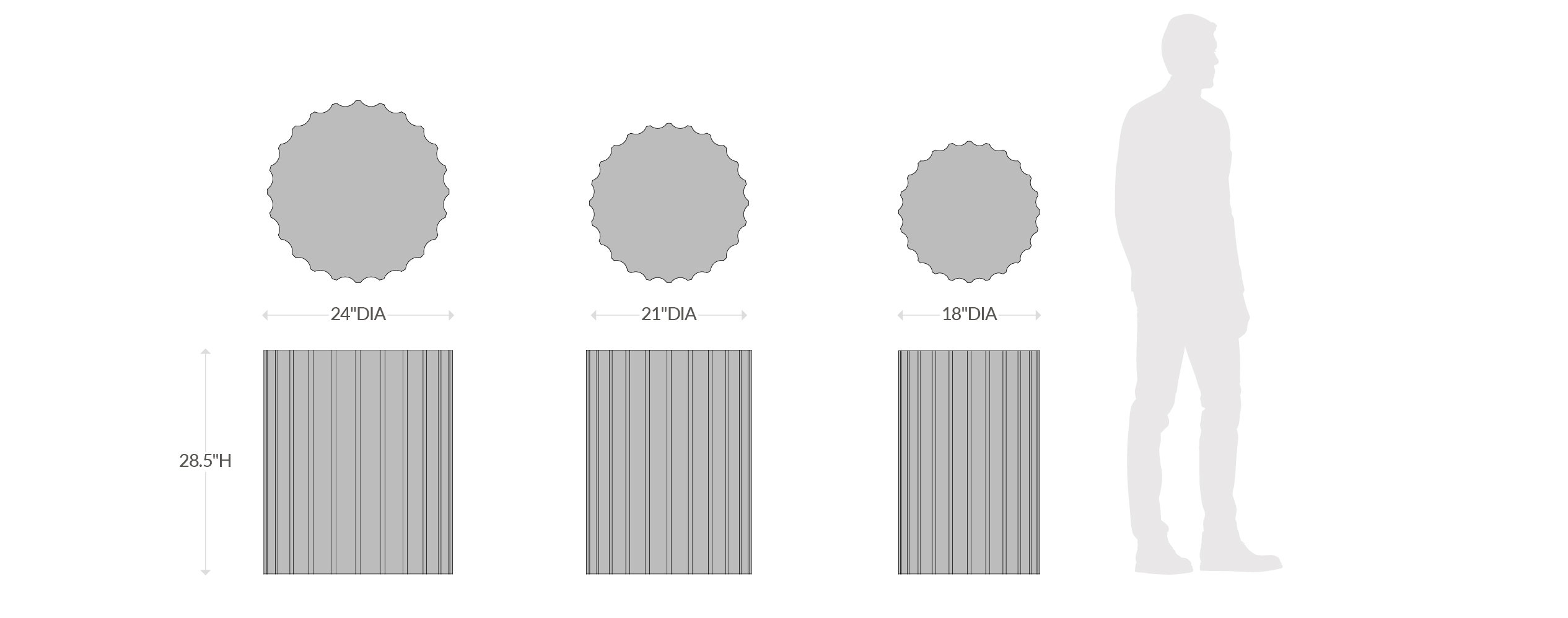 - Dimensions: 18" Dia. x 28.5"H, 21" Dia. x 28.5"H, 24"Dia. x 28.5"H