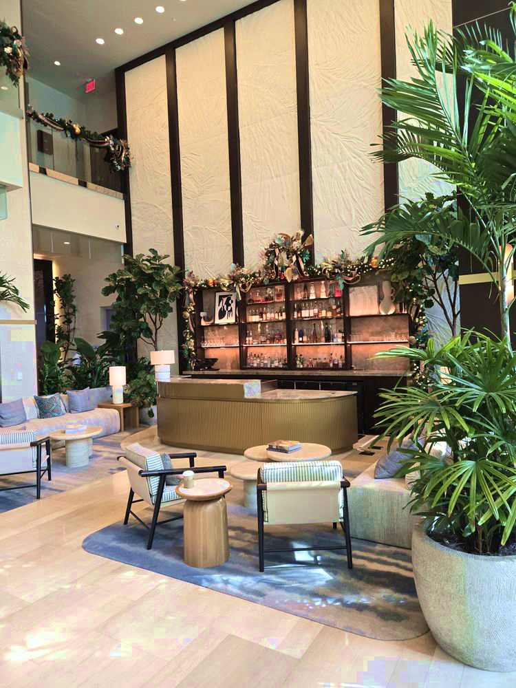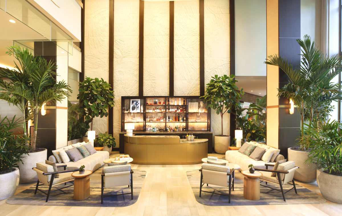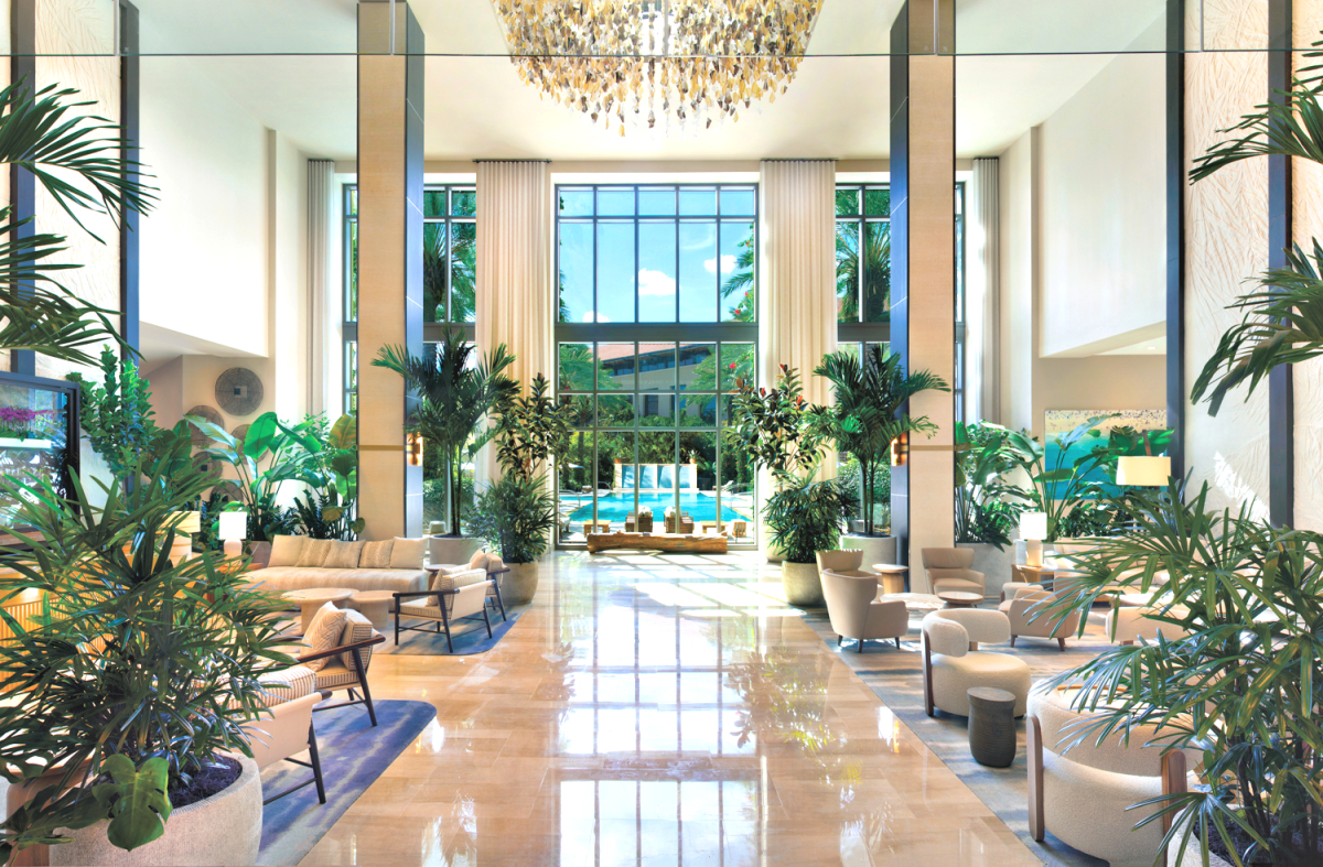 Following the resort’s $25 million property-wide redesign, led by Meyer Davis Studio, the lobby and bar areas at Hilton West Palm Beach emerged as inviting tropical-inspired spaces rich with palm views, native plant motifs and sophisticated finishes.